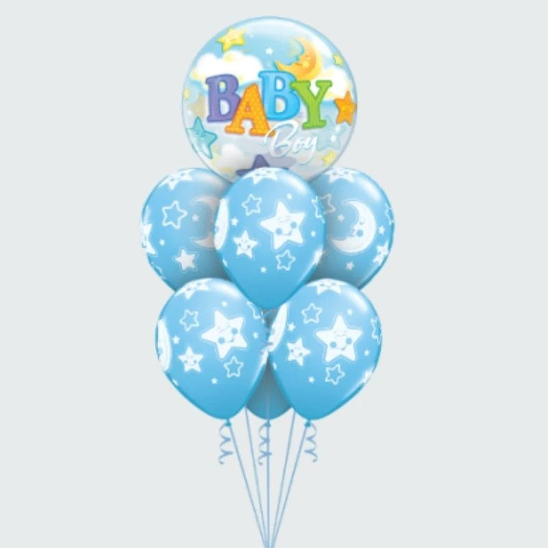 Brighten up your celebration with this Blue Baby Shower Balloon Bouquet! The precious balloon bouquet includes a large blue "Baby Boy" balloon as the centrepiece and 6 x matching round balloons with the unique starlight design. Ideal for baby shower celebrations!