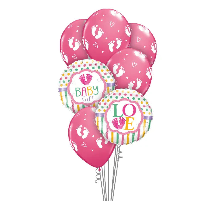 Brighten up your celebration with this Pink Baby Girl Shower Balloon Bouquet! The precious balloon bouquet includes a large pink "Baby Girl" balloon and large pink "LOVE" balloons as the centrepieces and 5 x matching round balloons with the unique starlight design. Ideal for baby shower celebrations!