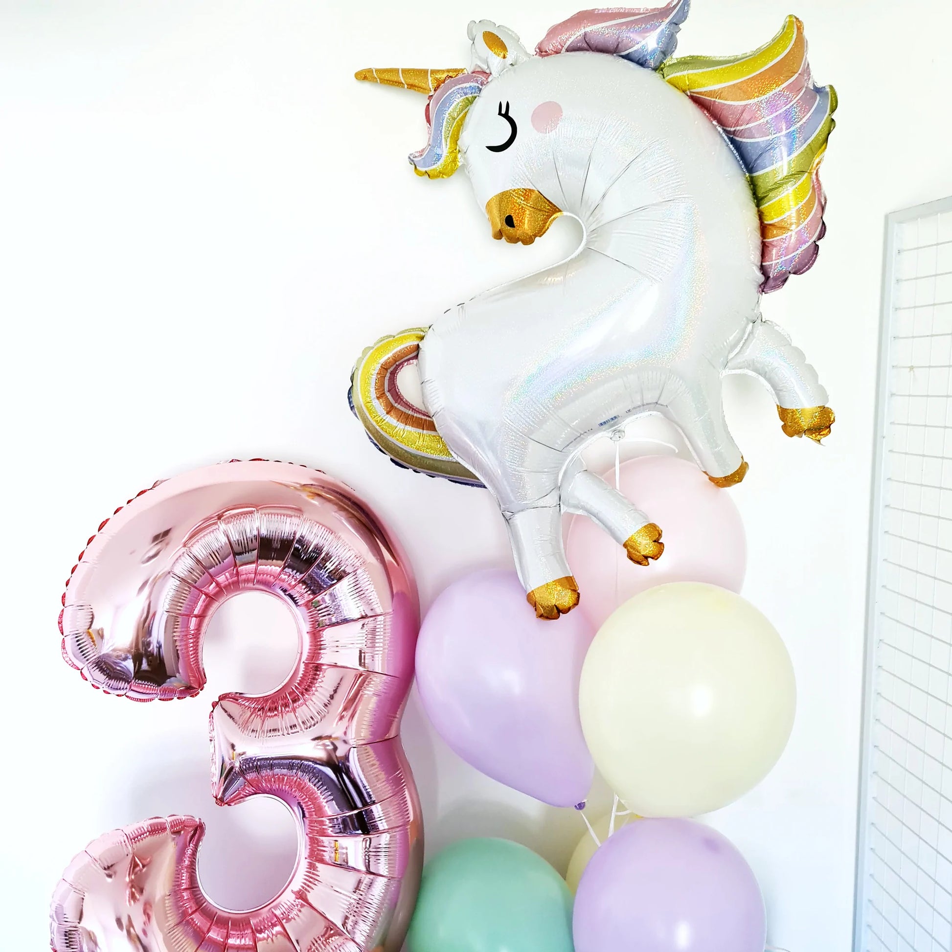Celebrate your little one's birthday with a delightful unicorn balloon, pink number balloon and mix of 6 crayola colour balloons.